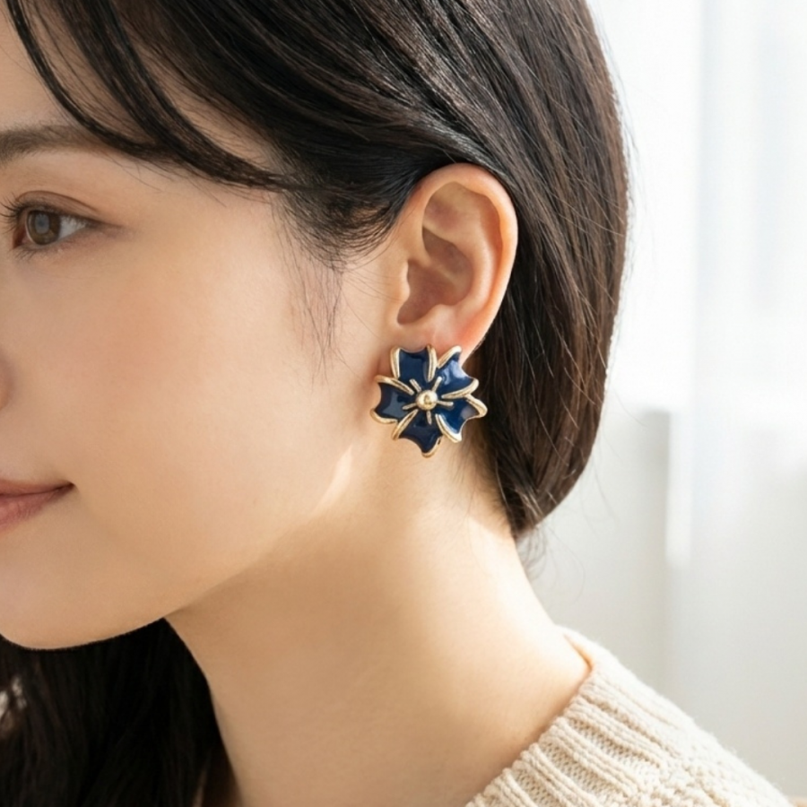 1980年代 ビンテージ ネイビーフラワー クリップイヤリング(ゴールド縁)