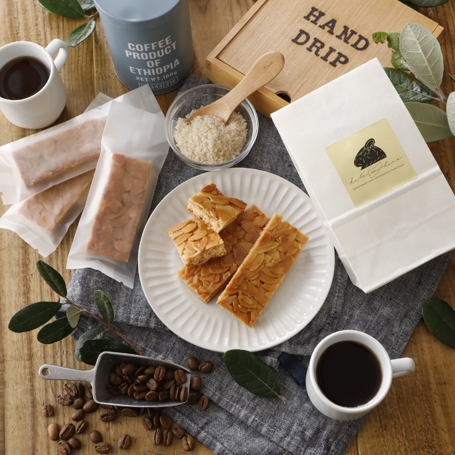 バターたっぷりのさくさくサブレの上に、焦がした喜界島ざらめでコーティングしたスライスアーモンドを敷き詰めて焼いた当店人気NO.1