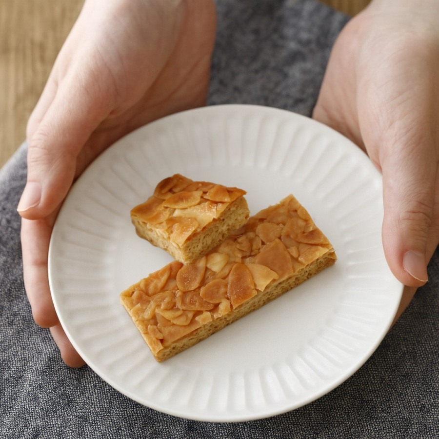 喜界島の自然が育んだ「島ざらめ」をふんだんに使い、独特のやさしい甘みと深いコクを引き出した焦がしざらめが香るフロランタンです。キャラメルに絡めたスライスアーモンドは香ばしく、カリッとした歯ざわり。下のサブレ生地はほろっと軽く、全体のバランスが絶妙です。