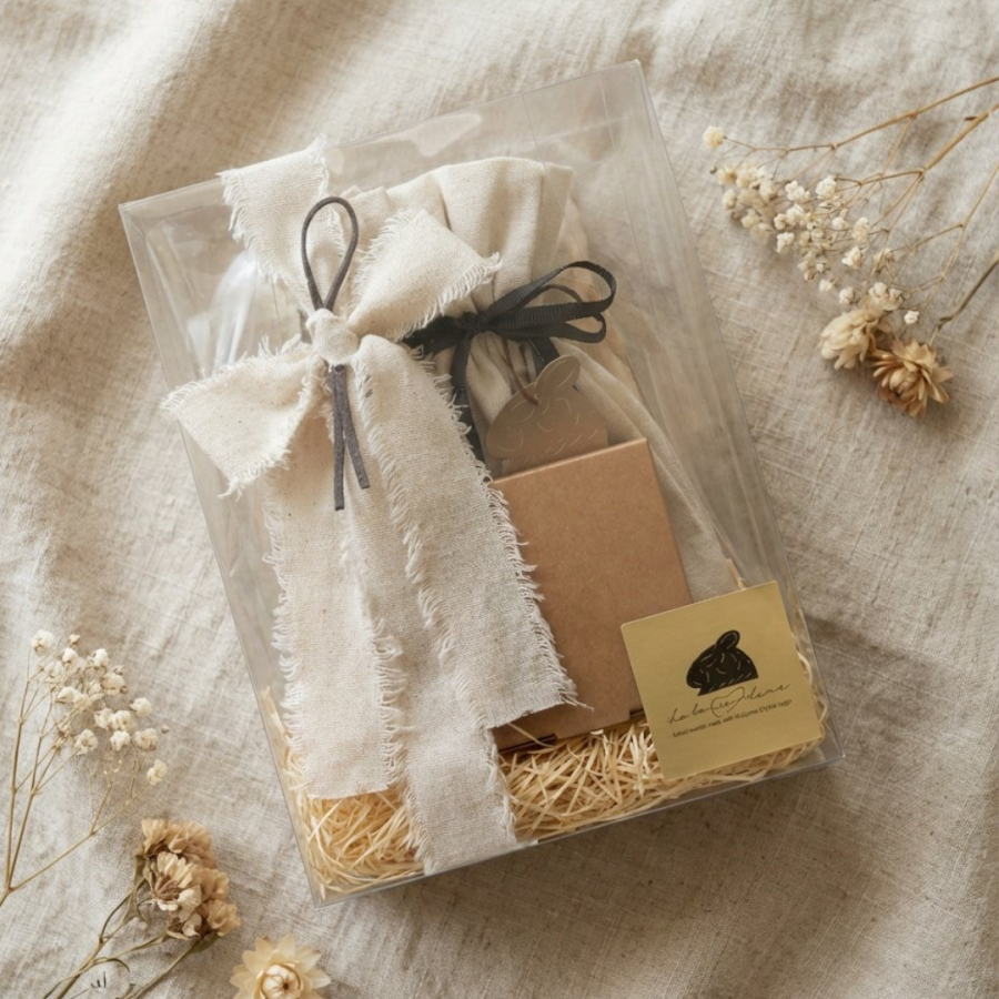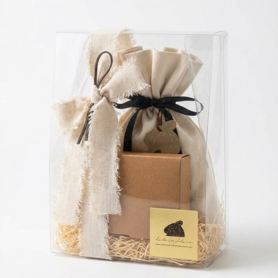クリアボックスに、巾着とリボンで仕上げた**“かわいいギフト仕様”**でお届け。